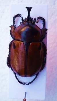 Coelosis biloba is a beetle that belongs to the group of horn beetles in the family Scarabaeidae. A large (30-40 millimeters), dark-colored horn beetle, the body shape is quite wide. As usual with horn beetles, there is a big difference between the sexes, the males are larger and have a horn on the head and a large hollow in front of the pronotum, above this with two wide, rounded projections. Pronotum has clear, fish shell-like microsculpture on the sides, coverts fine rows of dots. The female lacks horns and protrusions on the thorax, body shape oval. The species is widespread throughout the Neotropical ecosystem, from Mexico in the north to Chile in the south. The adult beetles are nocturnal and like to come to light. Otherwise, little is known about their biology. Coelosis is a genus of beetles. Coelosis belongs to the family Dynastidae.
