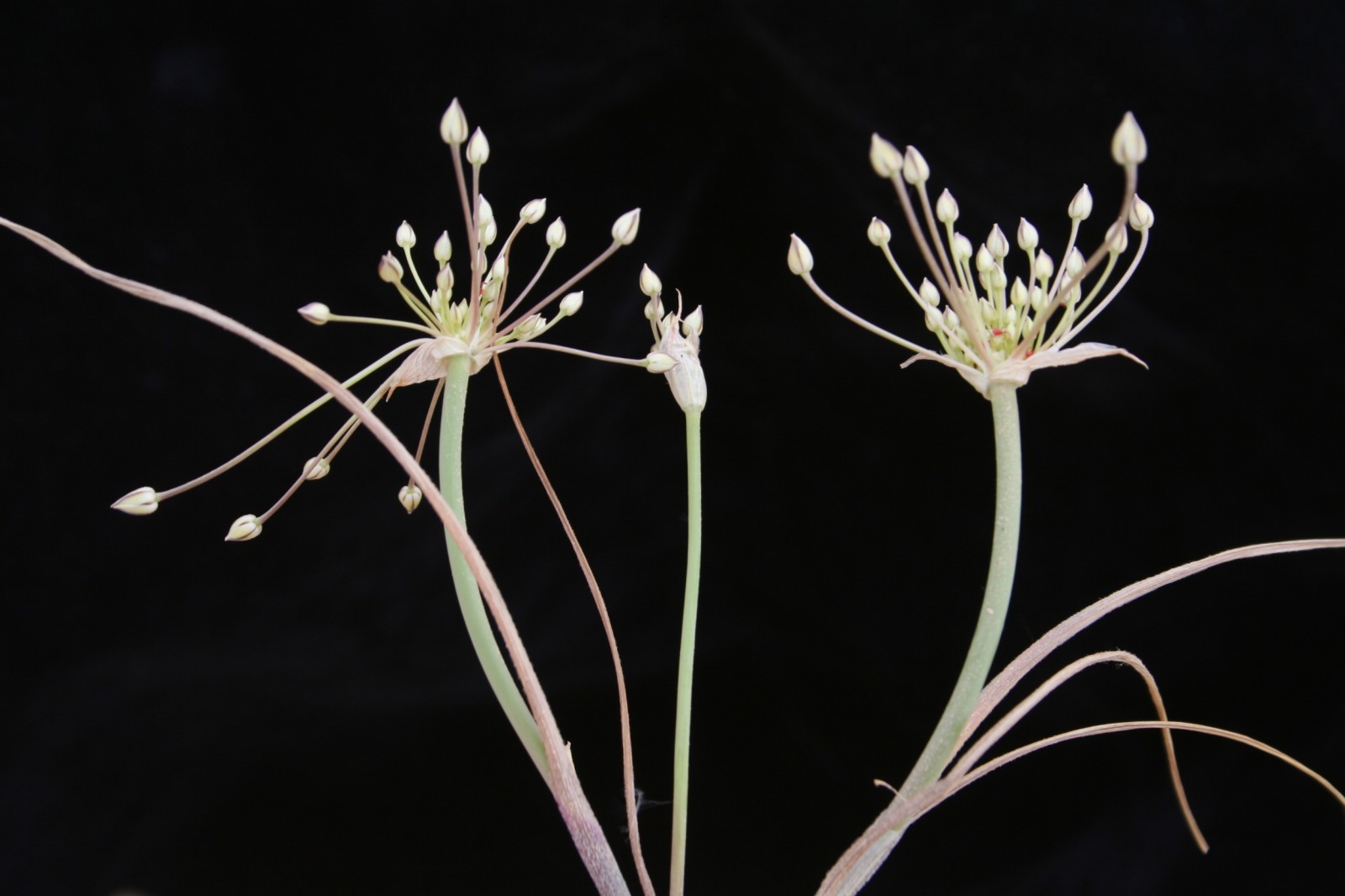 The genus Allium (alliums) is characterised by herbaceous geophyte perennials with true bulbs, some of which are borne on rhizomes and an onion or garlic odor and flavor. The bulbs are solitary or clustered and tunicate and the plants are perennialized by the bulbs reforming annually from the base of the old bulbs, or are produced on the ends of rhizomes or, in a few species, at the ends of stolons. A small number of species have tuberous roots. The bulbs' outer coats are commonly brown or grey, with a smooth texture, and are fibrous, or with cellular reticulation. The inner coats of the bulbs are membranous. Many alliums have basal leaves that commonly wither away from the tips downward before or while the plants flower, but some species have persistent foliage. Plants produce from one to 12 leaves, most species having linear, channeled or flat leaf blades. The leaf blades are straight or variously coiled, but some species have broad leaves, including A. victorialis and A. tricoccum. The leaves are sessile, and very rarely narrowed into a petiole. The flowers, which are produced on scapes are erect or in some species pendent, having six petal-like tepals produced in two whorls. The flowers have one style and six epipetalous stamens; the anthers and pollen can vary in color depending on the species. The ovaries are superior, and three-lobed with three locules. The fruits are capsules that open longitudinally along the capsule wall between the partitions of the locule The seeds are black, and have a rounded shape. The terete or flattened flowering scapes are normally persistent. The inflorescences are umbels, in which the outside flowers bloom first and flowering progresses to the inside. Some species produce bulbils within the umbels, and in some species, such as Allium paradoxum, the bulbils replace some or all the flowers. The umbels are subtended by noticeable spathe bracts, which are commonly fused and normally have around three veins. Some bulbous alliums increase by forming little bulbs or "offsets" around the old one, as well as by seed. Several species can form many bulbils in the flowerhead; in the so-called "tree onion" or Egyptian onion (A. --proliferum) the bulbils are few, but large enough to be pickled. Many of the species of Allium have been used as food items throughout their ranges. There are several poisonous species that are somewhat similar in appearance (e.g. in North America, death camas, Toxicoscordion venenosum), but none of these has the distinctive scent of onions or garlic.