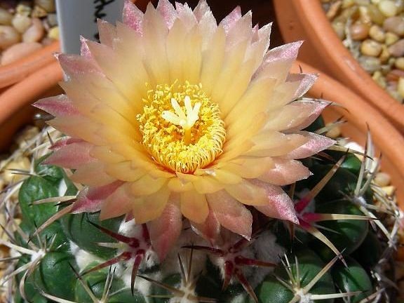 Kadenicarpus pseudomacrochele (Synonym Turbinicarpus pseudomacrochele), is a species of plant in the family Cactaceae. It is endemic to Hidalgo and Querétaro states of Mexico. Its natural habitat is hot deserts. It is an endangered species, threatened by habitat loss. Turbinicarpus is a genus of very small to medium-sized cacti, which inhabit the north-eastern regions of Mexico, in particular the states of San Luis Potosí, Guanajuato, Nuevo León, Querétaro, Hidalgo, Coahuila, Tamaulipas and Zacatecas. The taxon was first proposed by Curt Backeberg as Strombocactus subgenus Turbinicarpus. It was elevated to a genus in 1937 by Franz Buxbaum and Backeberg. The circumscription of Turbinicarpus has been described as "remarkably unstable", with species regularly transferred to other genera. Its taxonomic history is often mixed with that of other genera like Echinocactus, Echinomastus, Gymnocactus, Mammillaria, Neolloydia, Normanbokea, Pediocactus, Pelecyphora, Strombocactus, Thelocactus and Toumeya, as the results of almost two centuries of constant evolution in the understanding of the affinities and relationships inside the family Cactaceae. A genus revision by Davide Donati in 2003, and again in 2004 with Carlo Zanovello, was based on a wide range of characters. At the end of that study, Rapicactus was considered a distinct genus from Turbinicarpus. The genus Turbinicarpus was subdivided in two subgenera at the light of the results of the DNA analysis, and into many series because of the ontogeny of the spination. The broad circumscription of Turbinicarpus was recognized as polyphyletic by Hunt in 2016. These succulent plants grow mostly on limestone soil (never on volcanic soil), at altitudes between 300 and 3300 metres above sea level. Turbinicarpus species are usually confined to specific habitats, generally hostile for the majority of plants, mostly in very drained rocky areas, composed of limestone, sandstone, schist (neutral or alkaline), or in very acidic and humiferous understorey, or in gypsum veins, sometimes so pure that they are almost white. In particular, Turbinicarpus sensu stricto is adapted to extreme niches: more than 80% of the species grow in rock cracks or among the pebbles beneath them, where enough dust has accumulated to enable root development.
