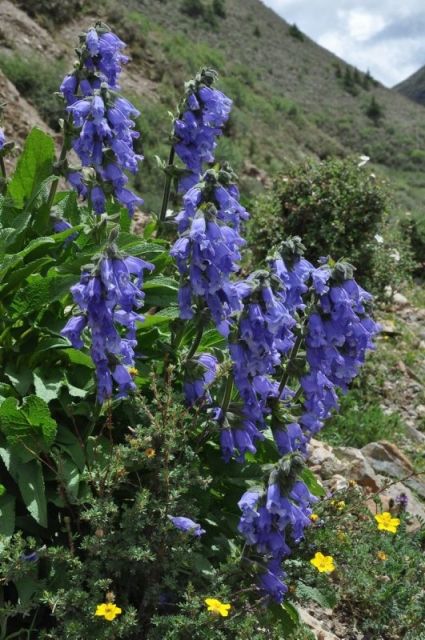 Salvia wardii is a perennial plant that is native to Tibet, found growing in alpine grasslands and thickets at 3,600 to 4,500 m (11,800 to 14,800 ft) elevation. It grows 50 to 75 cm (20 to 30 in) high, on strong stems that are glandular and hairy, forming into a thick spreading plant. It has many basal leaves that are ovate to subhastate, 7 to 16 cm (2.8 to 6.3 in) long and 3.5 to 8 cm (1.4 to 3.1 in) wide. The upper leaf is slightly ridged with short hairs, the underside has red glandular hairs, especially dense on the veins. The 3.5 to 4 cm (1.4 to 1.6 in) corolla is blue with white on the lower lip, held in a purple tinged calyx, growing on terminal panicles or racemes.