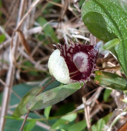 Corybas pruinosus ( Synonym:Corysanthes pruinosa) commonly known as the toothed helmet orchid, is a species of terrestrial orchid endemic to New South Wales. It grows in moist forests and has a single round or heart-shaped leaf and a relatively small, translucent grey flower with dark red markings. Corybas pruinosus is a terrestrial, perennial, deciduous, herb with a single round or heart-shaped leaf 8–30 mm (0.3–1 in) long and 10–20 mm (0.4–0.8 in) wide. The leaf is green on the upper surface and silvery green on the lower side. There is a single translucent grey flower with dark red markings. The dorsal sepal is 20–28 mm (0.8–1 in) long and 10–13 mm (0.4–0.5 in) wide curves forward over the labellum. The lateral sepals are linear, 7–10 mm (0.3–0.4 in) long and 1 mm (0.04 in) wide and the petals are about 6 mm (0.2 in) long and 1 mm (0.04 in) wide, often with two points on the tip. The labellum is 9–12 mm (0.4–0.5 in) long and 5–6 mm (0.20–0.24 in) wide with a greyish mound in the cente, many short bristles and its edges with many long, narrow teeth. Flowering occurs from April to July. The toothed helmet orchid grows in forest with shrubs between Nelson Bay, Moruya and Paterson. The toothed helmet orchid was first formally described in 1871 by Richard Cunningham and given the name Corysanthes pruinosa. The description was published in the New South Wales Magazine. In 1871, Heinrich Gustav Reichenbach changed the name to Corybas pruinosus. The specific epithet (pruinosus) is a Latin word meaning "frosty" or "rimy".
