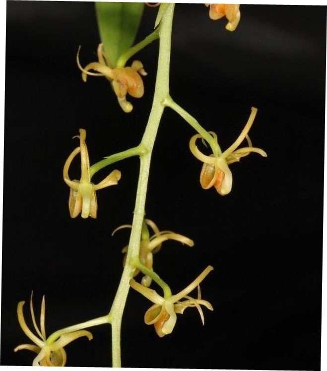 Liparis fleckeri, commonly known as the slender sphinx orchid, is a plant in the orchid family and is endemic to Queensland. It is an epiphytic or lithophytic orchid with two thin leaves and up to twenty pale green or whitish flowers. It grows in rainforest at altitudes of 900 m (3,000 ft) or more in tropical far North Queensland. Liparis fleckeri is an epiphytic or lithophytic herb with fleshy, dark green pseudobulbs 25–35 mm (0.98–1.4 in) and 20–30 mm (0.8–1 in) wide. There are two thin, dark green, linear to lance-shaped leaves 15–35 mm (0.6–1 in) long and about 2 mm (0.08 in) wide. Between five and twenty pale green or whitish flowers, 10–12 mm (0.4–0.5 in) long and 8–10 mm (0.3–0.4 in) wide are borne on an arching flowering stem 150–250 mm (6–10 in) long. The sepals are 8–9 mm (0.3–0.4 in) long, about 2 mm (0.08 in) wide and the petals are a similar length but only about 0.2 mm (0.008 in) wide. The sepals and petals are tapered and curve downwards. The labellum is 6–8 mm (0.2–0.3 in) long, 3–4 mm (0.1–0.2 in) wide with two orange calli. Flowering occurs between May and August. Liparis fleckeri was first formally described in 1938 by William Henry Nicholls from a specimen collected by Hugo Flecker on Mount Bellenden Ker. The description was published in The North Queensland Naturalist, the specific epithet (fleckeri) honouring Hugo Flecker. The mountain sprite orchid grows on rocks and trees in rainforest at altitudes between 900 and 1,600 m (3,000 and 5,000 ft) between Cedar Bay National Park and Tully.