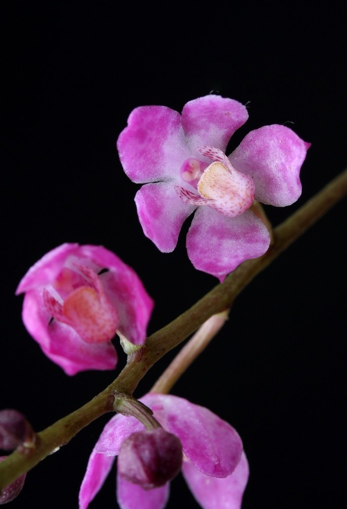 Sarcochilus ceciliae, commonly known as fairy bells, is a lithophytic orchid endemic to eastern Australia. It has up to ten channelled, spotted linear leaves and up to twenty pink flowers with a hairy labellum. Sarcochilus ceciliae is a lithophytic herb that forms small clumps on rocks. It has an erect, branching stem 30–120 mm (1–5 in) long with between four and ten channelled, spotted linear leaves 40–120 mm (2–5 in) long and 3–8 mm (0.12–0.31 in) wide. Between three and twenty pale to bright pink, cup-shaped flowers 4–8 mm (0.2–0.3 in) long and wide are arranged on a flowering stem 70–200 mm (3–8 in) long. The dorsal sepal is 4–6 mm (0.16–0.24 in) long, about 3 mm (0.12 in) wide and the lateral sepals are a similar length or slightly longer. The petals are 4–5 mm (0.16–0.20 in) long and about 2 mm (0.079 in) wide. The labellum is fleshy and about 3 mm (0.12 in) long and has three lobes. The side lobes are erect and hairy and the middle lobe is short, thick and densely hairy. Flowering occurs between October and March. Sarcochilus ceciliae was first formally described in 1865 by Ferdinand von Mueller and the description was published in Fragmenta phytographiae Australiae from a specimen collected near Cleveland Bay by Edward Bowman. The specific epithet (ceciliae) honours Cecilia Viennot van Maseyk. Fairy bells mainly grows on rocks and cliff faces in humid places. It occurs between the Atherton Tableland in Queensland and the Hastings River catchment in New South Wales.