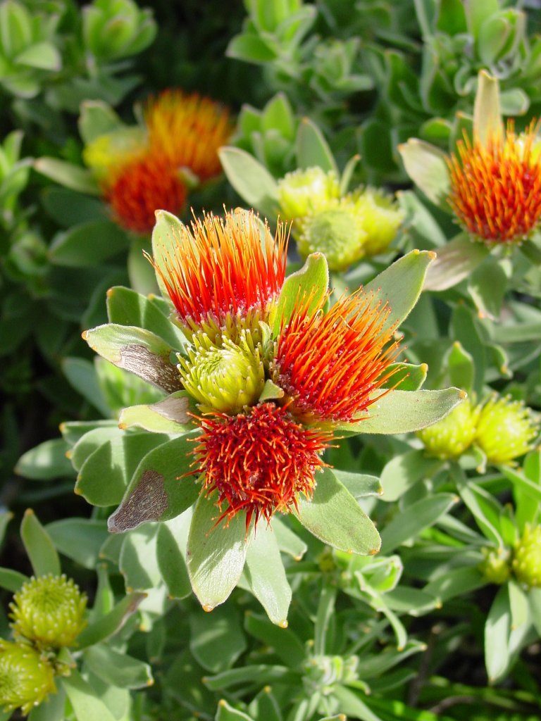 Leucospermum oleifolium is an erect shrub of about 1 m (3.3 ft) high and 1½ m (5 ft) across that is assigned to the Proteaceae family. It has spreading branches, densely set with initially felty, entire, oval, olive-colored leaves of about 3½ cm (1½ in) long and 1½ cm (0.6 in) wide, with a bony tip that sometimes has two to five blunt teeth, with a blunt base and conspicuous veins. The flowers and their long thread-like styles are initially sulfur yellow, but soon become orange and finally turn brilliant crimson. The flower heads are about 4 cm (1.6 in) in diameter, crowded at the tip of the branches with a maximum of five that start flowering in turn. This provides for a colour spectacle from August till December. It is called by various names in South Africa such as Overberg pincushion, flame pincushion, mix pincushion and tuft pincushion. It naturally occurs in fynbos in the Western Cape province of South Africa.