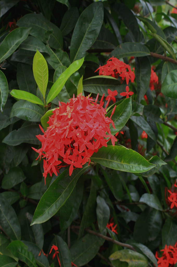 Ixora is a genus of flowering plants in the Rubiaceae family. It is the only genus in the tribe Ixoreae. It consists of tropical evergreen trees and shrubs and holds around 545 species.Though native to the tropical and subtropical areas throughout the world, its centre of diversity is in Tropical Asia. Ixora also grows commonly in subtropical climates in the United States, such as Florida where it is commonly known as West Indian Jasmine. Other common names include viruchi, rangan, kheme, ponna, chann tanea, techi, pan, siantan, jarum-jarum/jejarum, jungle flame, jungle geranium among others. The plants possess leathery leaves, ranging from 3 to 6 inches in length, and produce large clusters of tiny flowers in the summer. Members of Ixora prefer acidic soil, and are suitable choices for bonsai. It is also a popular choice for hedges in parts of South East Asia. In tropical climates they flower year round and are commonly used in Hindu worship, as well as in ayurveda and Indian folk medicine.